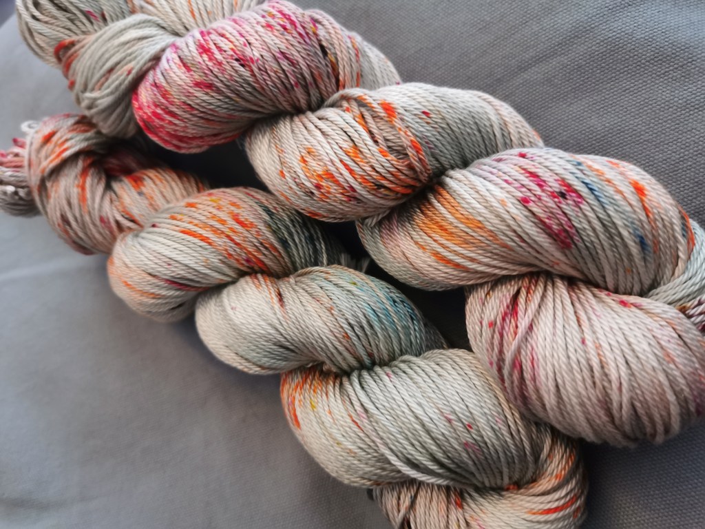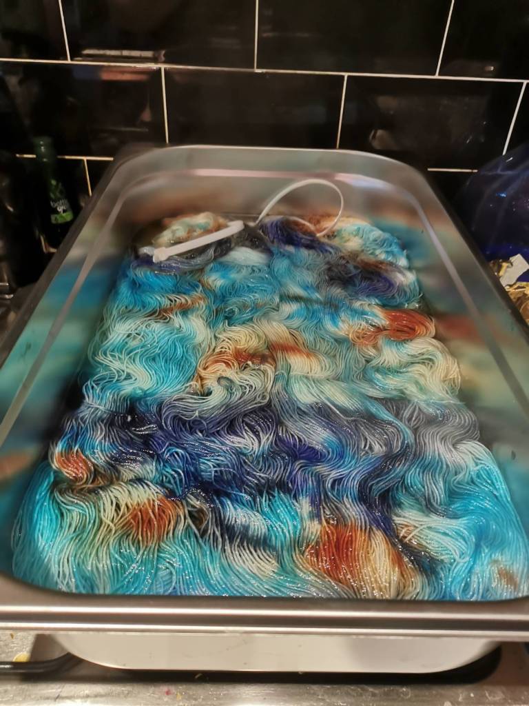 For speckled I’d wash, and then soak with the fixer. Squish to take out lots of the water. Lay it out (I spread it out a bit) on cling film (saves the surface but also for wrapping it later) put on mask, sprinkle dry powder gently over the yarn and let it sit for a bit (if you wrap it straight away the colours may squish and it won’t be speckled). Wrap it and then heat it in either a microwave for 3 mins (in the cling film on a plate/bowl) or in a steamer on the hob/stove. Let cool, wash and rinse.