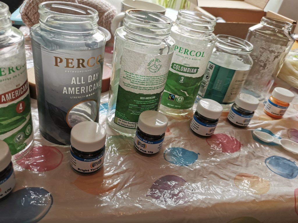 A pot, tongs, gloves, washing up bowl, mask, measuring spoons and jugs, cups or bowls, bottles, spoons, zip/cable ties, kitchen roll, cling film/plastic wrap. I could go on but basically choose the type of dyeing you want to do next. If you just want dip dye then you will need less than if you want to speckle. But anything you use shouldn’t be used for food after. Excuse for some new kitchen gear?!