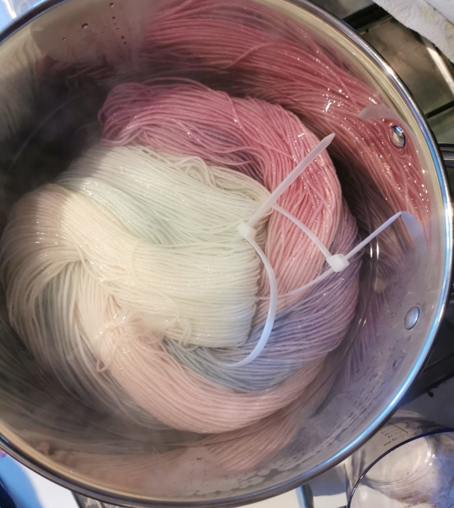For dip dyed I’d wash and soak the yarn. Add water to the dye pot with the dye and the fixer. Heat it and then slowly lower some of the yarn dipping it in and out and letting a little bit more yarn go into the pot each dip. This will give it a gradual colour. Some may even break into different colours. Then once all of the yarn is in the pot leave for 10 minutes on a simmer until the colour has all been absorbed. Take out to cool, wash and rinse.