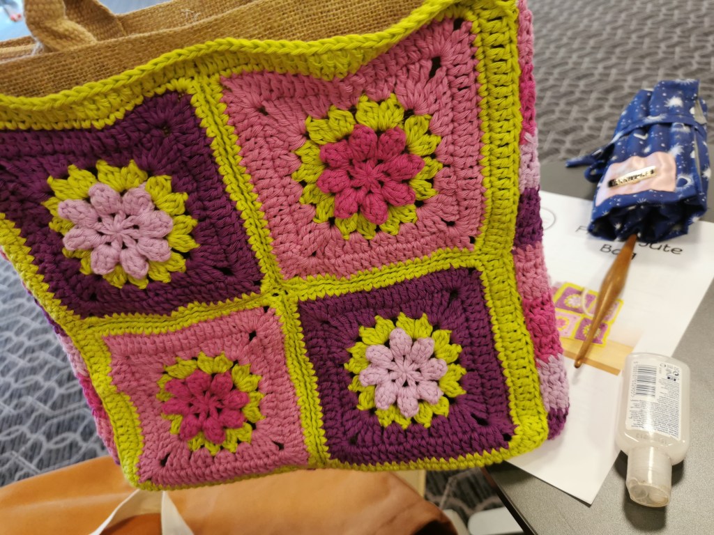 On my way to the room I spotted someone with a neon stitchers tshirt saying Crocheter on it sat in the sunshine (thankyou Sharon for wearing that top!). I decided I’d go and introduce myself and see if I could join.