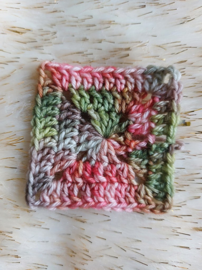 This one works up beautifully with areas of the reg and orange, some greys, browns and a multilayered green. Scroll to see the crochet granny square!