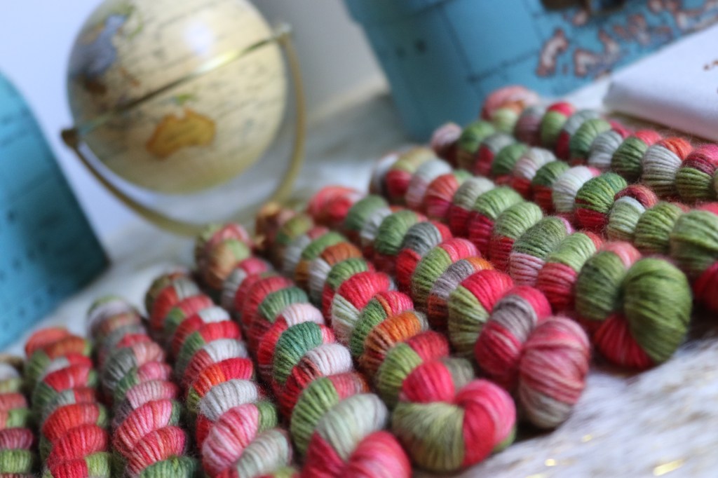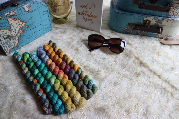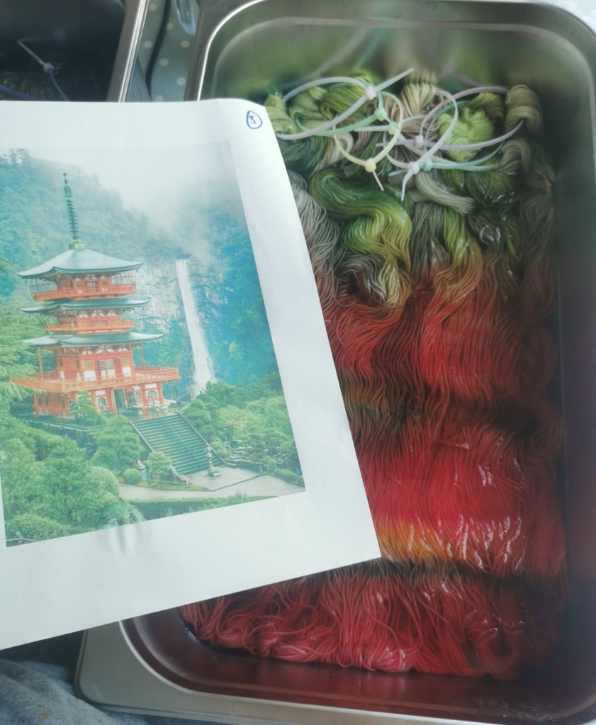 The jarring contrast between the red and oranges of the shrine against the natural greens of the scenery around the falls was easy inspiration for this colourway and the dyebath makes me so happy.