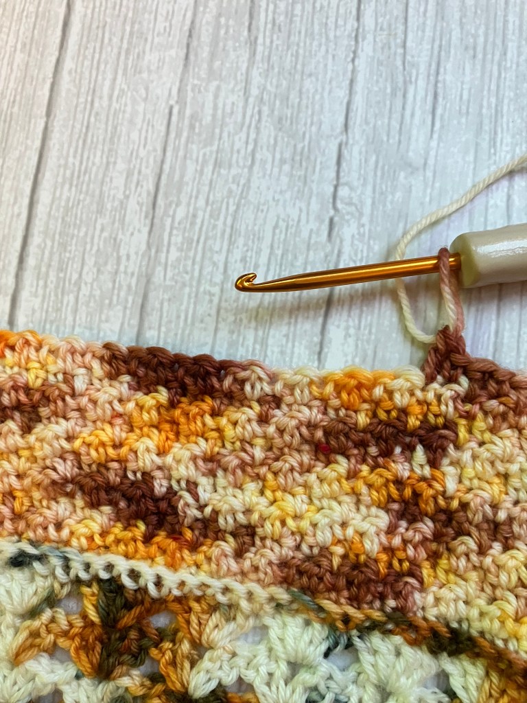 Beautiful golden brown and marigolds meet the ivory and camel colours in the middle. Beautiful in its simplicity.