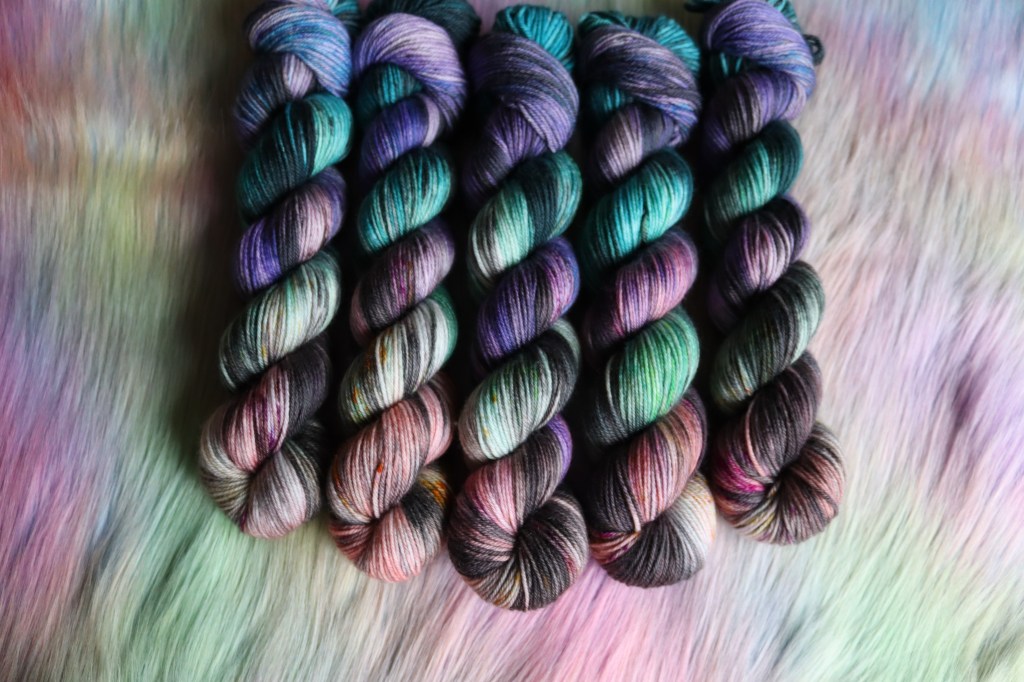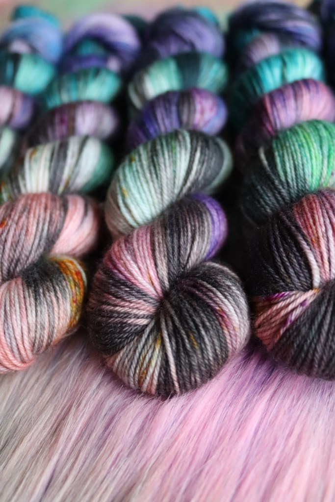 This colourway has my heart! I mean it would, because it’s a pale rainbow with speckles and contrasting black. Flashes of the bright lights definitely make this colourway special.