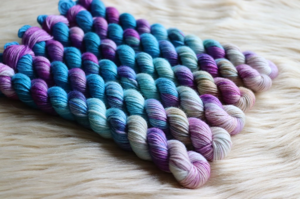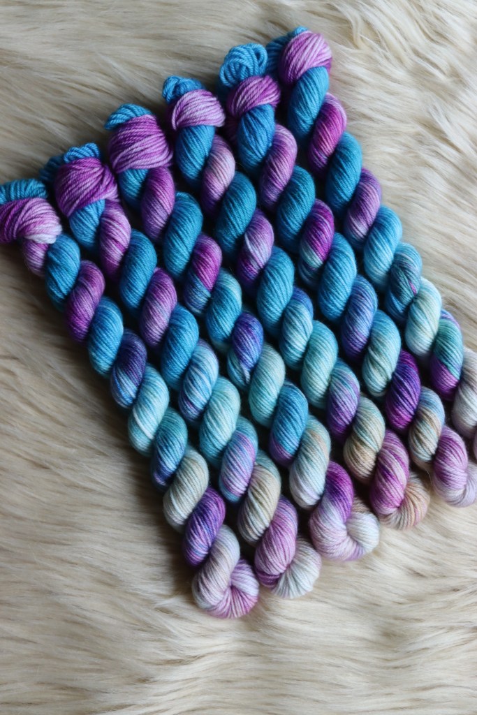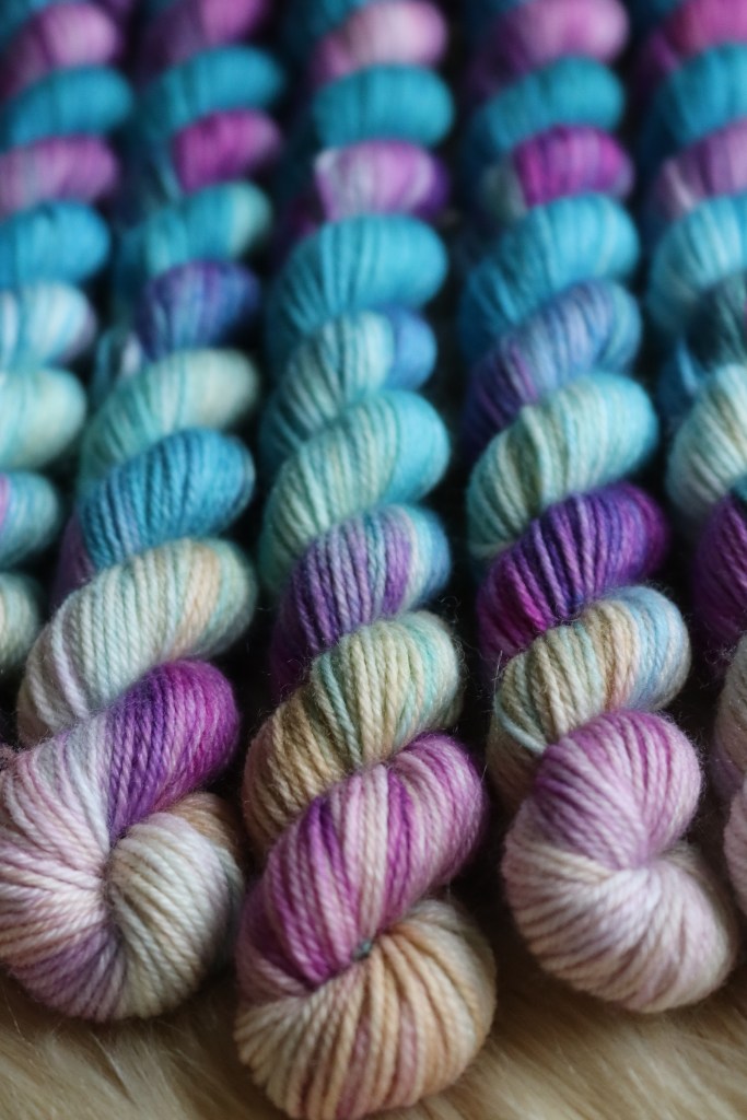 A beautiful yarn inspired by the colours of the Reef and the mermaid iridescent scales. Tones of blue and green meet with pale sand yellow, pinks and purples.