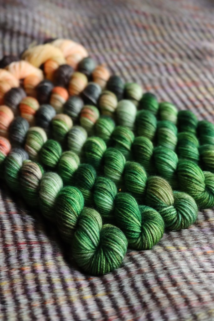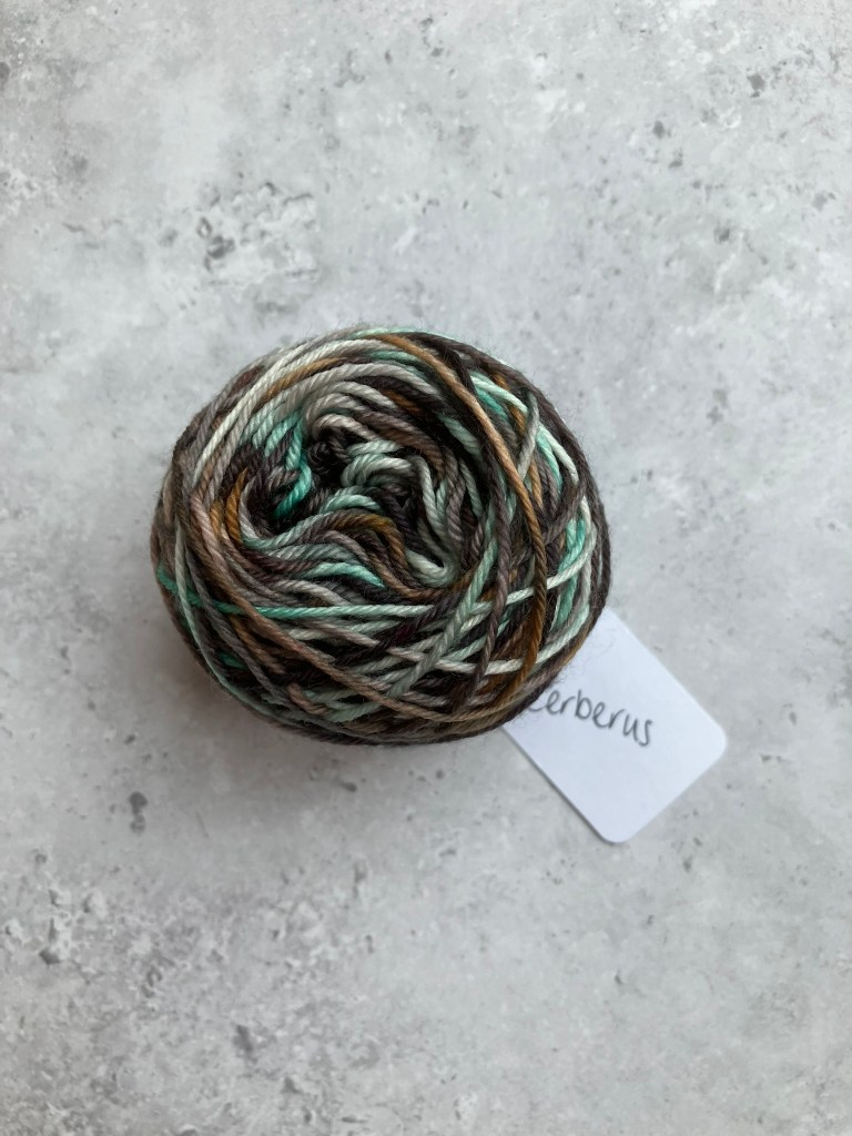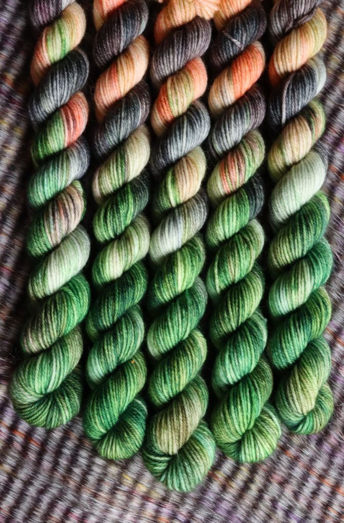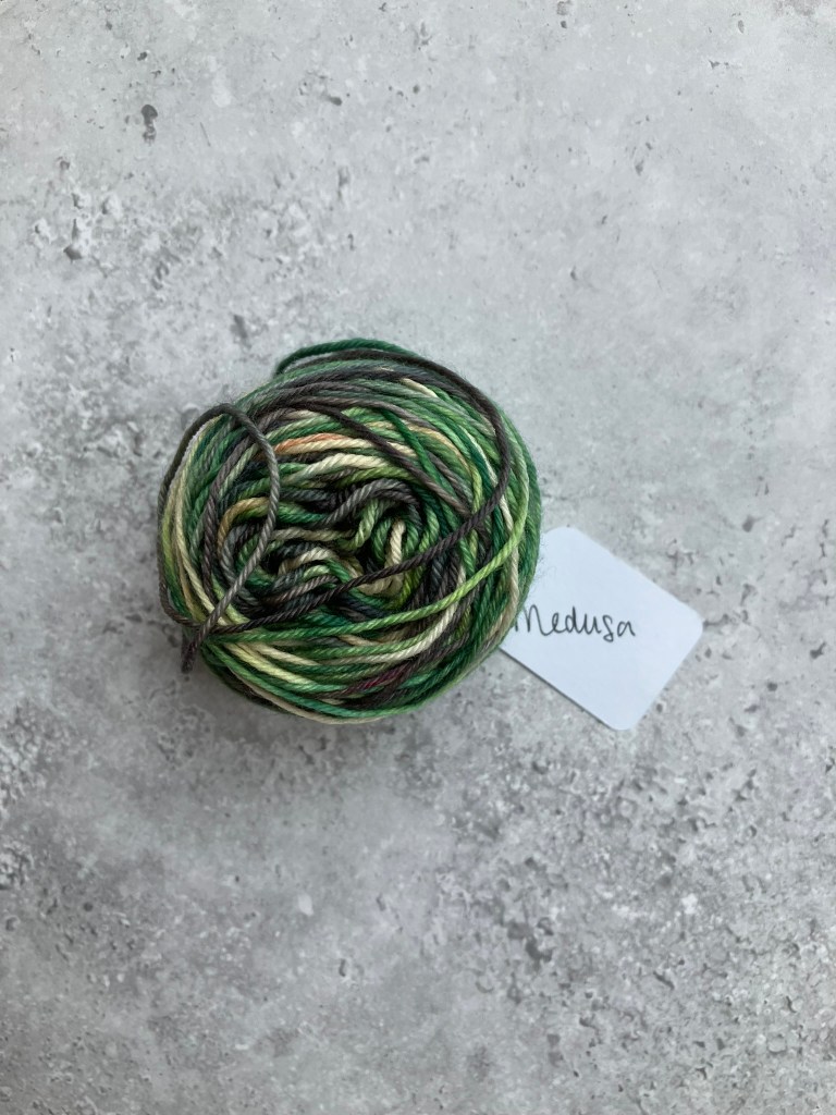 Deep greens, greys, and mixed browns make this the rich colourway on our final 50g. This grungy colourway perfectly finishes this triangle for the dark realm in Phantasmaland.